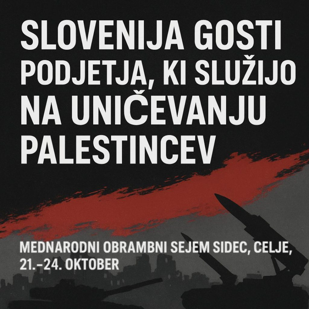 Med 21.-24 oktobrom bo v Celju potekal mednarodni obrambni sejem SIDEC, ki ga organizirata Ministrstvo za obrambo in Grozd obrambne industrije Slovenije. Organizatorji ga predstavljajo kot priložnost za spoznavanje »obrambnih tehnologij nove generacije«, med razstavljavci pa bodo tudi podjetja, ki že desetletja s svojim sodelovanjem z izraelsko vojsko prispevajo k izvajanju represije nad palestinskim prebivalstvom. Njihovo orožje je danes preizkušeno tudi v genocidu v Gazi. Je razsežnost uničenja Gaze dokaz njihove tehnološke »inovativnosti«?
