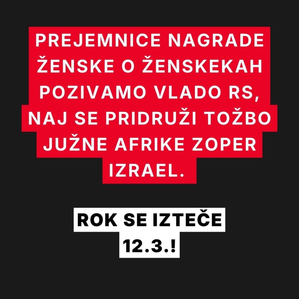 Spodaj podpisane prejemnice nagrade Ženske o ženskah pozivamo vlado Republike Slovenije, naj izpolni obljubo in napoved, ter se pridruži tožbi Južne Afrike pred Meddržavnim sodiščem zoper Izrael zaradi kršitev Konvencije o preprečevanju in kaznovanju zločina genocida. Rok za pridružitev tožbi se bo iztekel ta teden, 12. marca.